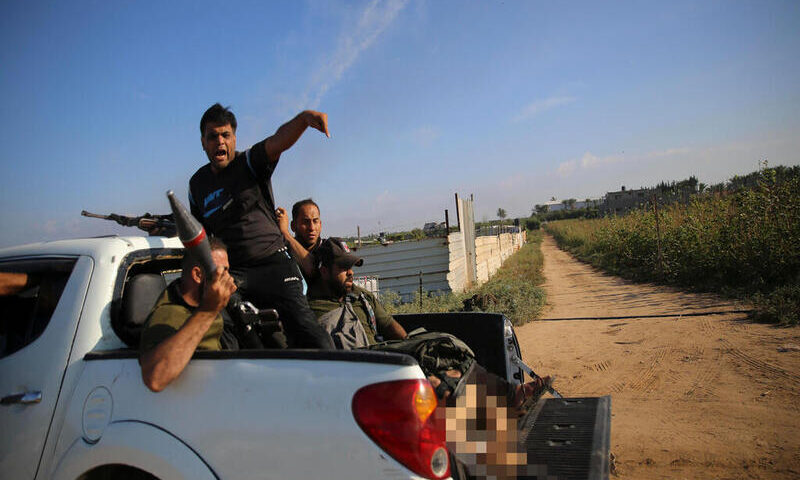 מחבלי חמאס עם גופה של חטופה ב-7 באוקטובר (צילום: AP Photo/Ali Mahmud)